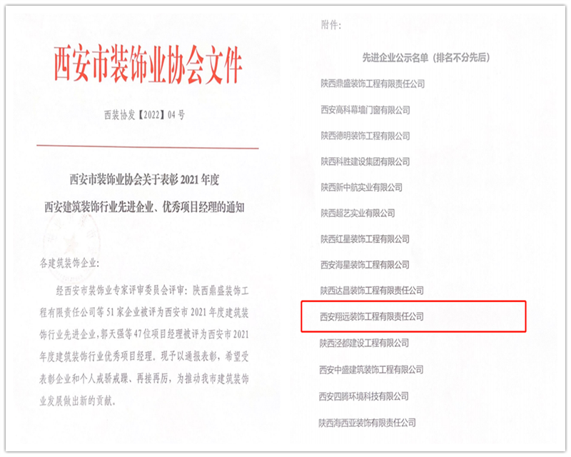 經西安市裝飾業專家評審委員會評審:西安翔遠裝飾工程有限責任公司被評為2021年度建筑裝飾行業優秀企業。