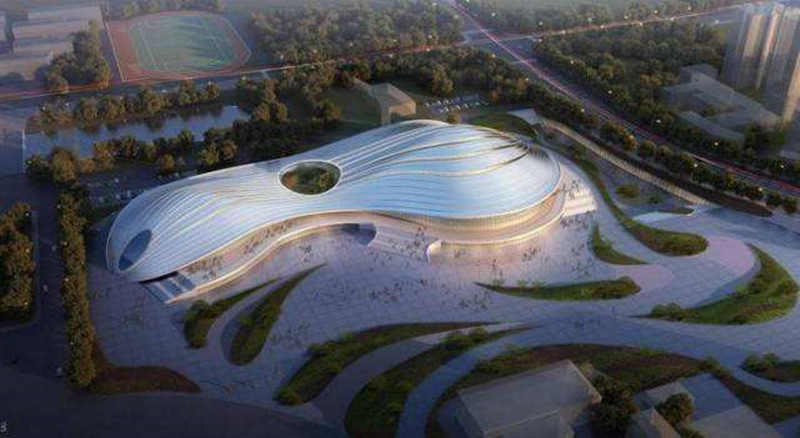 陜西奧體中心體育館的屋蓋外形設計新穎獨特,猶如大唐樂舞中回環飄舞的絲帶,給人以靈動、飄逸之感。西安作為絲綢之路的起點,該館象征著絲綢之路起點上徐徐展開的絲帶。
