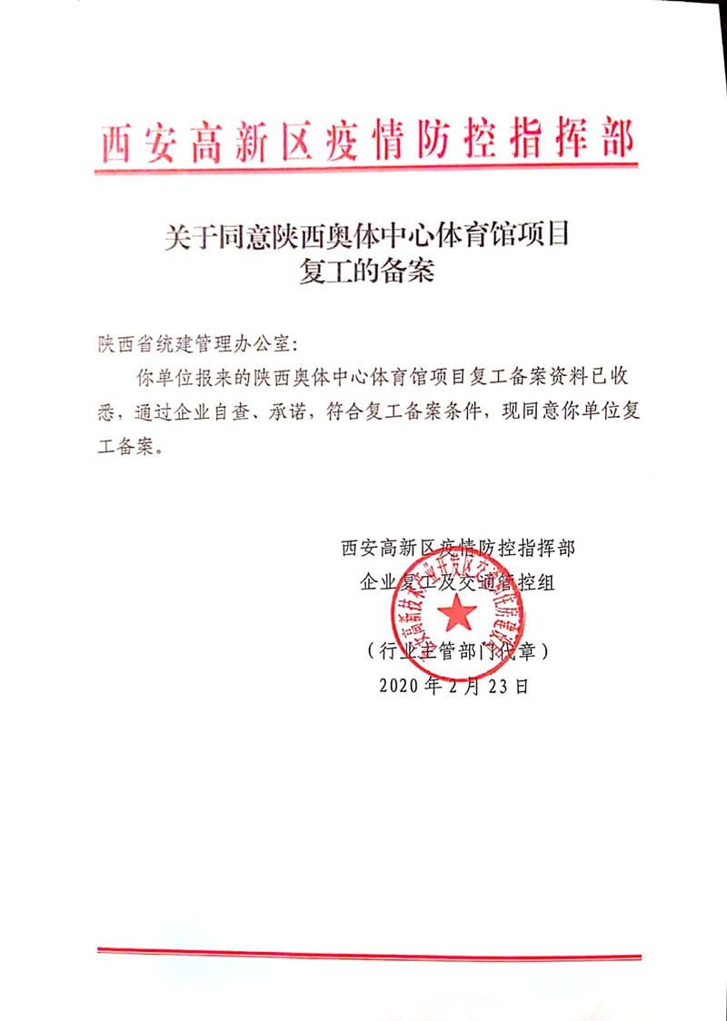 疫情期間,為確保陜西奧體中心體育館順利按期交付使用,我司在項目申請復工批準后,迅速組織落實勞務班組、材料、機械、設備等,項目管理人員于2020年2月24日到達現場,多措施組織勞務施工人員準時到達施工現場,多方協調材料供貨廠家、加工廠,確保材料及時供應和現場施工有序進行,并采購充足防疫物資,確保現場防護及施工安全。