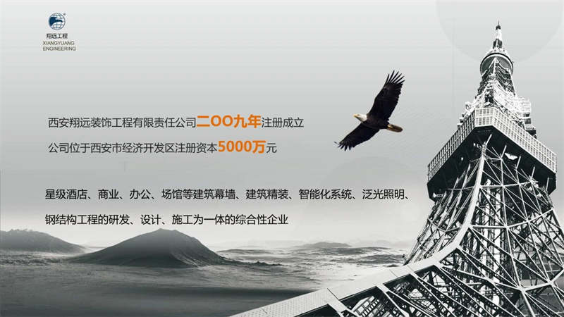 西安翔遠裝飾工程有限責任公司是一家集星級酒店、商業、辦公、場館等建筑幕墻、建筑精裝、智能化系統、泛光照明、鋼結構工程的研發、設計、施工為一體的綜合性企業。公司擁有建筑幕墻工程專業承包一級、建筑裝修裝飾工程專業承包一級、建筑裝飾工程專項設計乙級、建筑幕墻工程專項設計乙級等資質。是西安市建筑裝飾協會副會長單位、西安市裝飾業協會設計專業委員會副主任單位、西安市裝飾業協會幕墻委員會副主任單位、陜西省建筑裝飾協會常務理事單位、秦商總會常務理事單位、中國建筑裝飾協會會員單位、中國建筑裝飾協會綠色智慧建造分會副會長單位、中國建筑裝飾行業AAA級信用單位、中國綠色建筑裝飾品牌創新力品牌機構、A級納稅人、國家高新技術企業等。